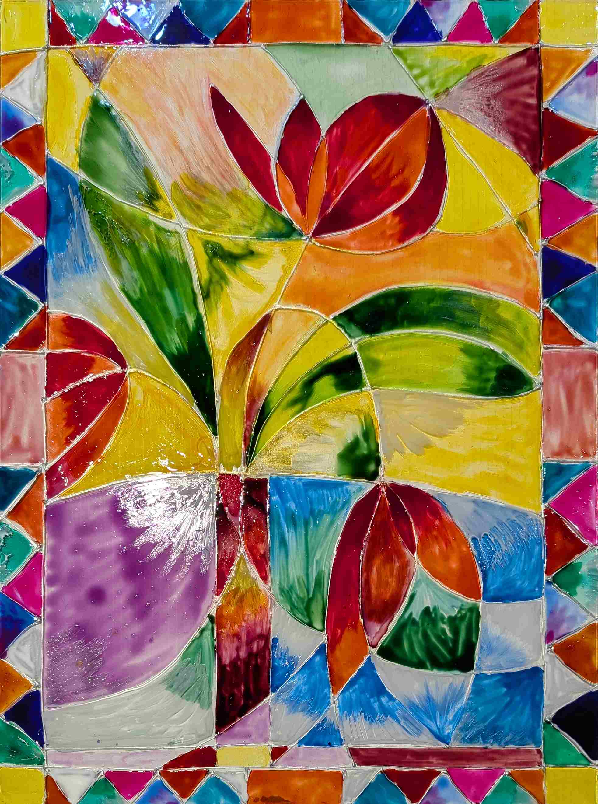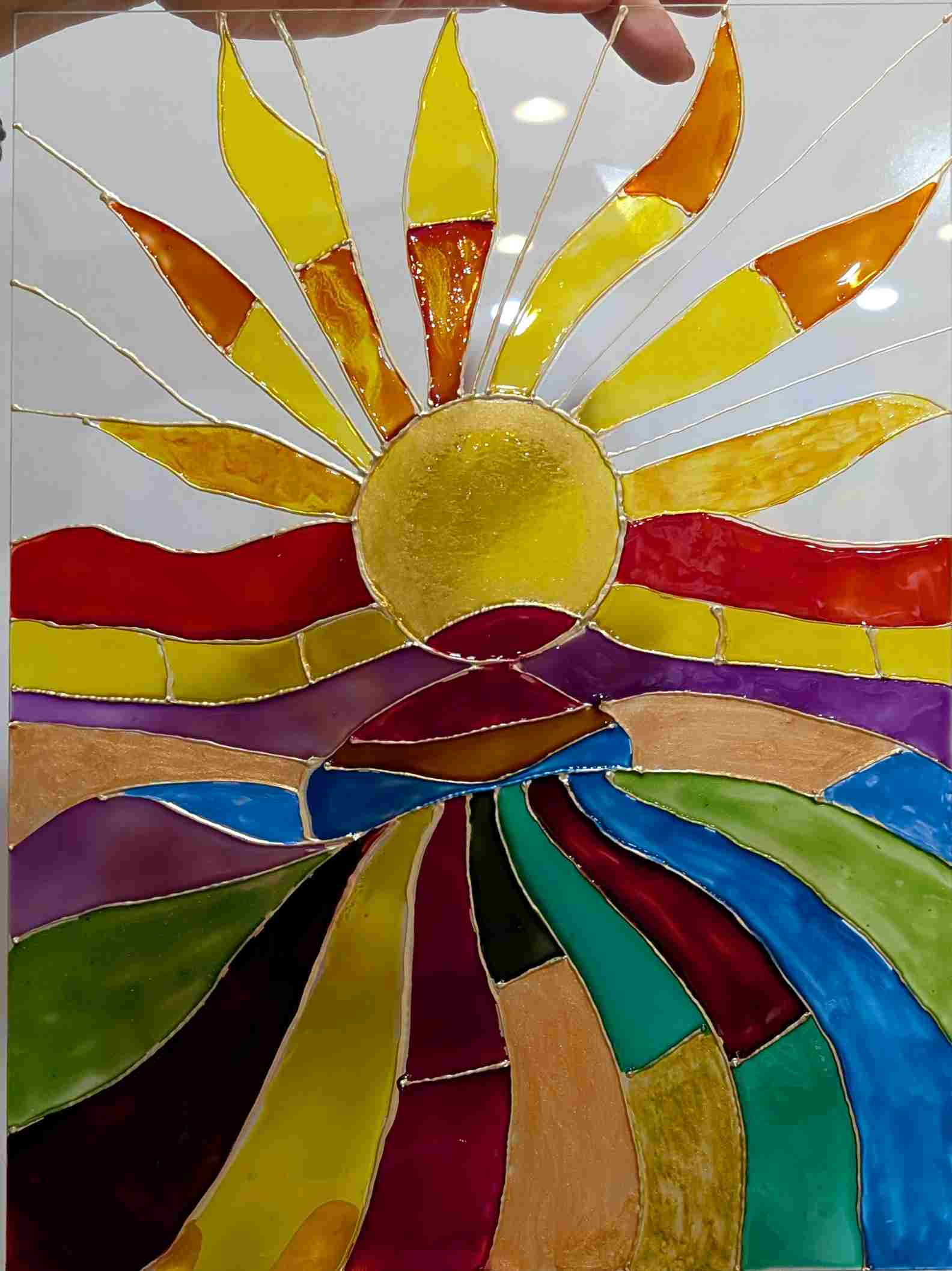 Dry and Display: Allow the paint to dry completely. Once done, your faux stained glass piece is ready to hang on a wall or in front of a window, where it can catch the light beautifully.