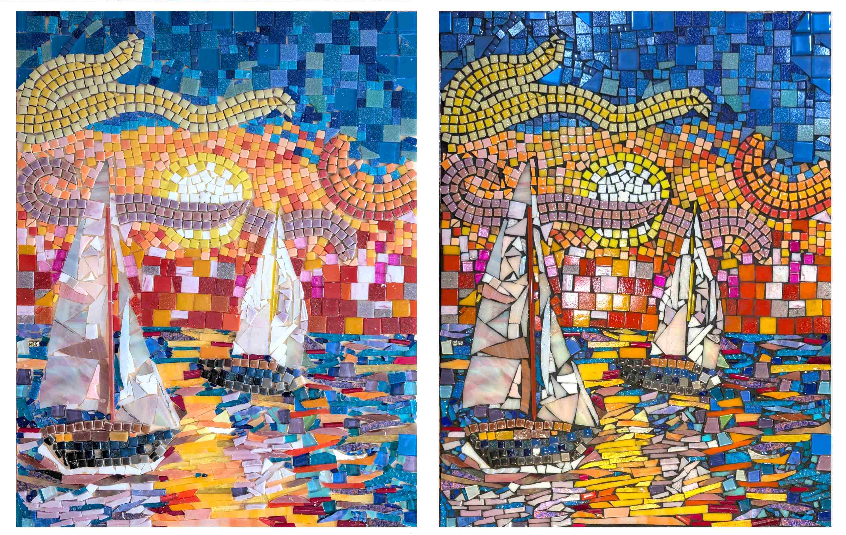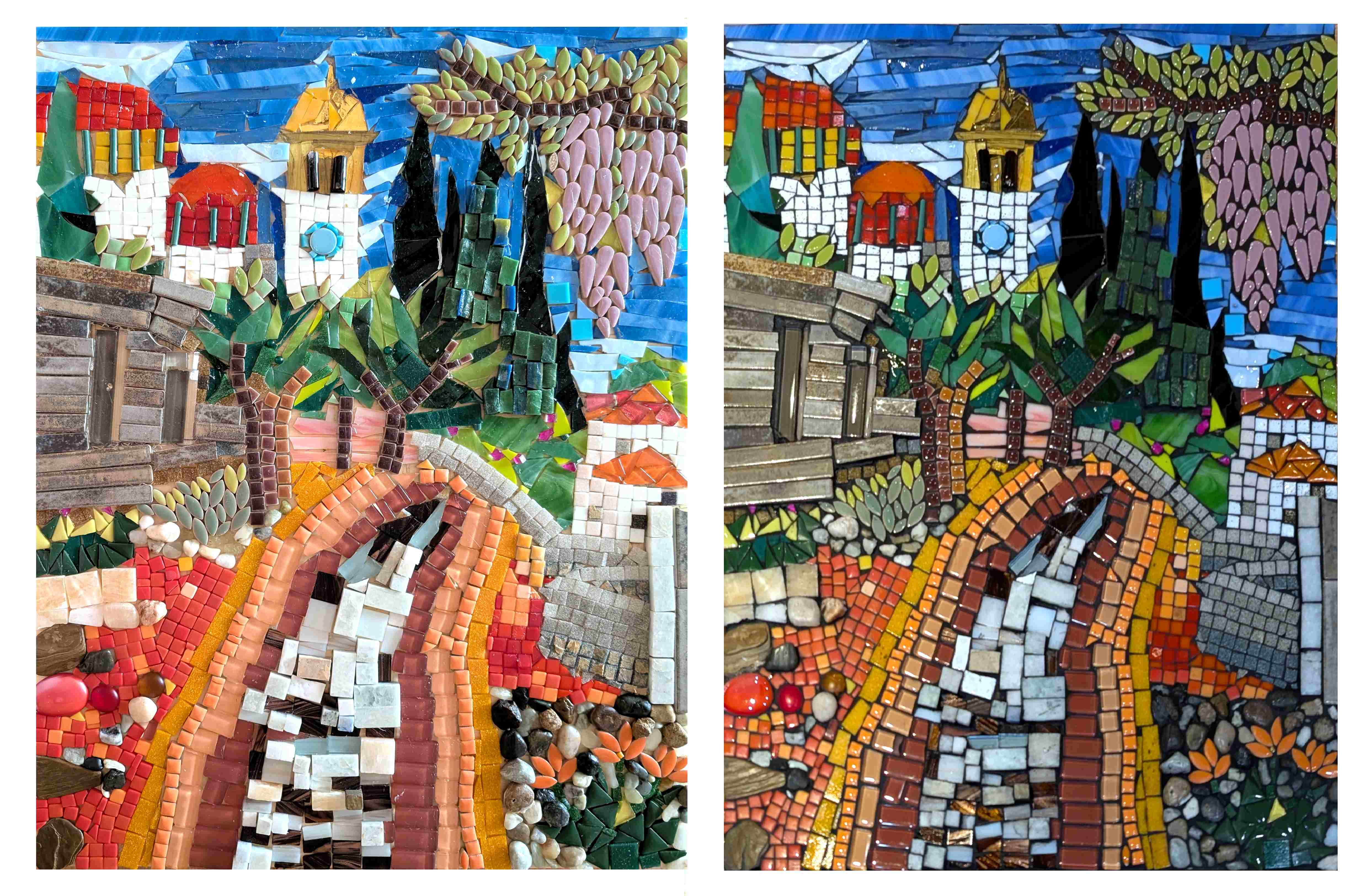 Take two mosaic panels from Rush In Art Studio—same materials, same design, different finish.